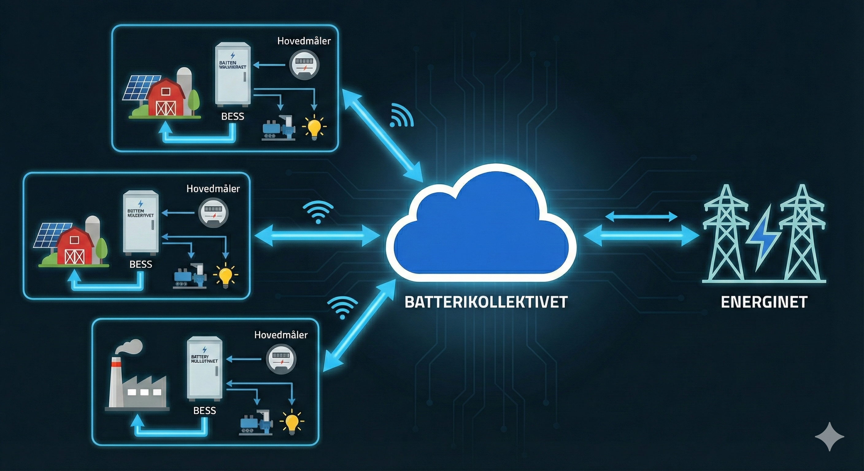 Vi bygger vores system efter de lokale forhold, så batterierne først og fremmest kan hjælpe den lokale landmand eller virksomhed. Derudover kender systemet de danske elpriser og har et bud på prisen en uge frem baseret på vejrudsigten og andre kendte forhold. Dette bruger vi aktivt til at lægge en strategi for op- og afladning samt hvornår vi deltager i tilgængelige el-markeder.